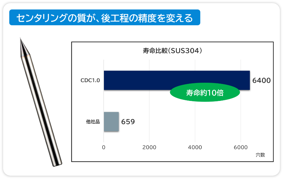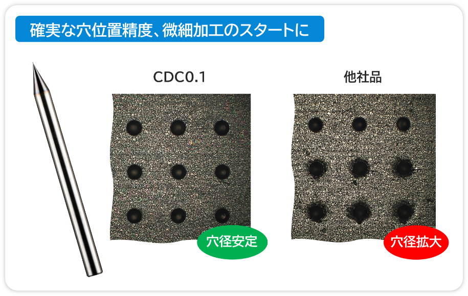 - シャンク径Φ3.0に対し、h4公差(0/-0.003)を採用する事で、振れ精度と穴位置精度を更に追及。