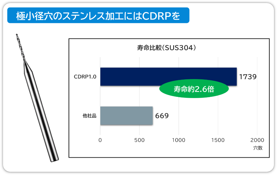- 超薄膜 Purple Coating を施すことで、SUS 加工に抜群の効果を発揮。ノンコート比2倍以上の高寿命!