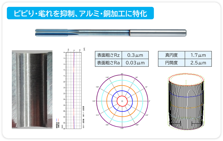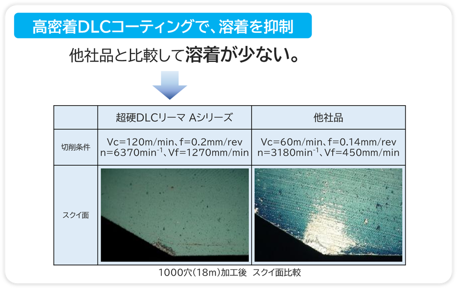 - 耐摩耗性と耐溶着性に優れたDLCコーティング(水素フリー)により、構成刃先を抑制し、抜群の表面粗さを実現!