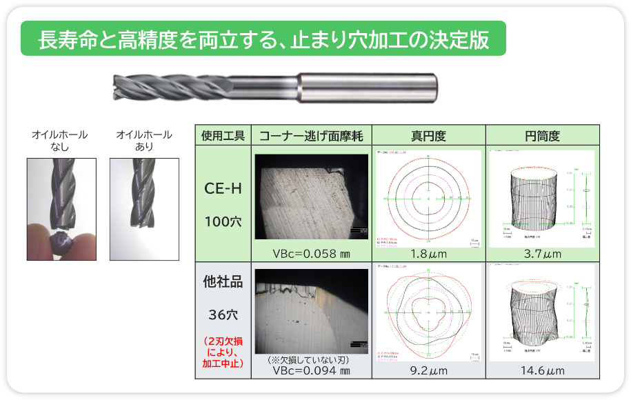- センタースルータイプのオイルホールを採用。切りくずの排出性が向上し、完全止まり穴加工において、より安定した加工が可能。