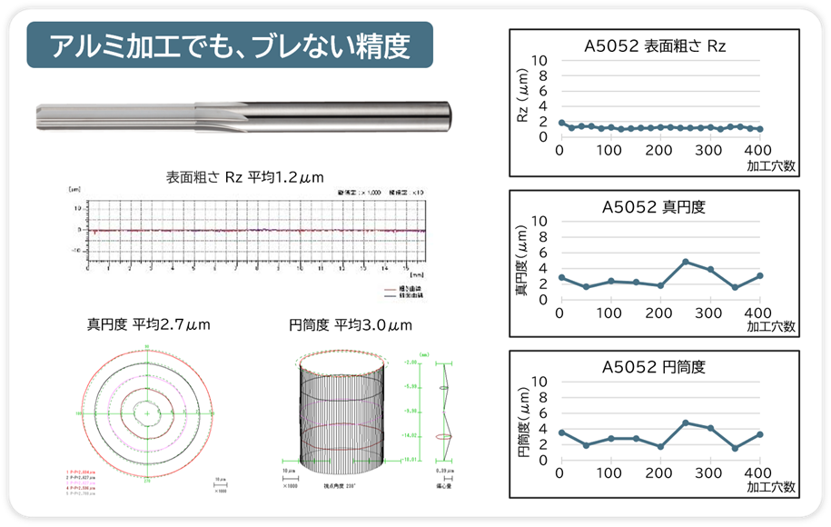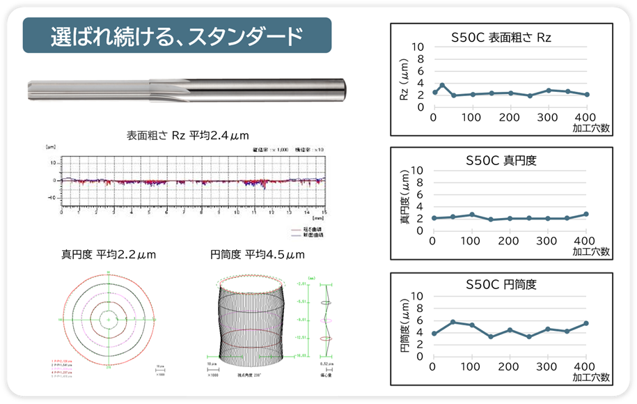 - 超硬素材の採用により、ハイスリーマと比べ、更なる高速·高能率加工が可能。