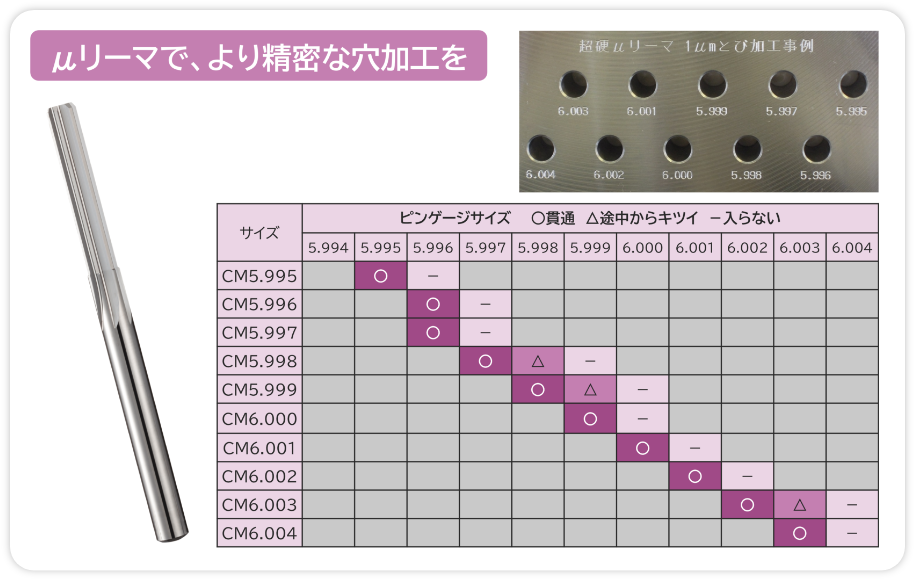 - 刃径公差0~+1μm未満により超精密穴加工に最適。