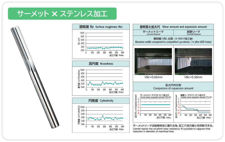 - 耐摩耗性・耐溶着性に優れたサーメット材を採用。ステンレス加工に特化し、抜群の面粗度を実現!